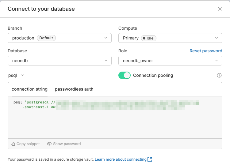또 기본 database 설정은 neondb로 되어있지만 이걸 다른 데이터베이스를 생성하여 변경해도 무방합니다.
