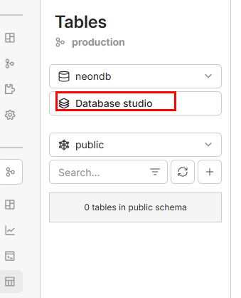 NeonDB같은 경우에는 굳이 DBMS를 연결하지 않더라도 간단한 기능같은 경우에는 전부 웹 콘솔에서 실행하고 적용할수 있도록 해놨습니다. 좌측의 메뉴에서 Tables를 선택하면 아래와 같은 창이 뜨게 되는데 이때Database studio를 클릭합니다.