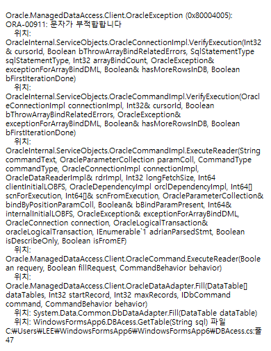 ORA-00911 문자가 부적합 합니다. 라는 오류가 발생했습니다.
