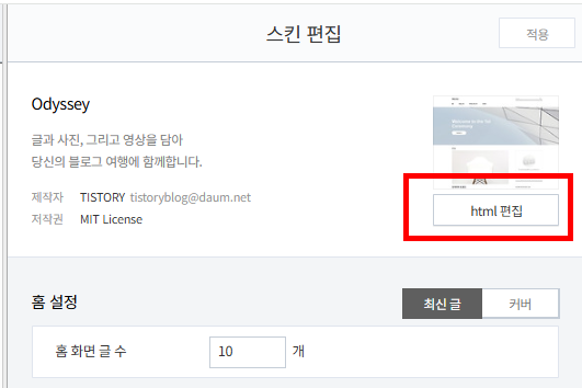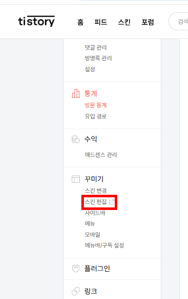 2. 티스토리의 꾸미기-스킨편집을 클릭