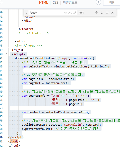 5. 찾은 /body의 앞에 복사한 스크립트를 붙여 넣어 줍니다.