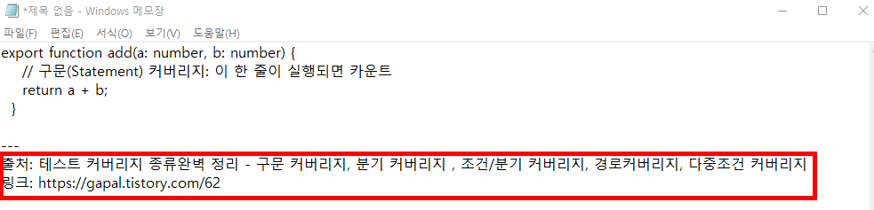 위처럼 코드를 복사하고 메모장에 붙여 넣으면 아래와 같이 복사된 글에 저의 출처가 남게 됩니다.
