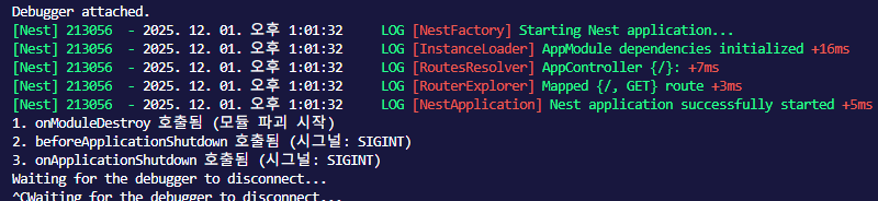 - 특징: 모든 모듈의 onModuleDestroy()가 병렬적으로 실행되지만, 다음 단계로 넘어가기 전에 모두 완료되어야 합니다.