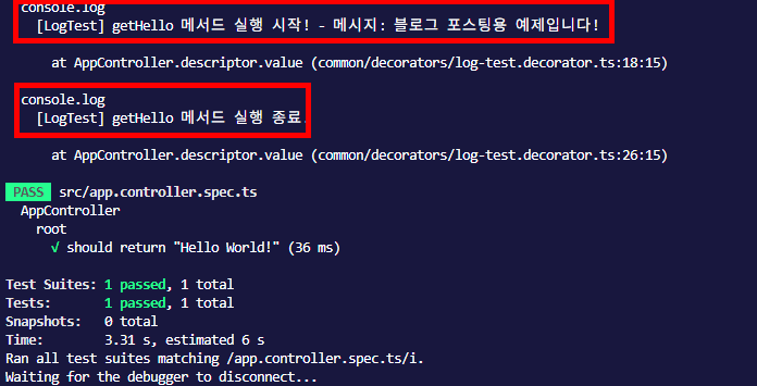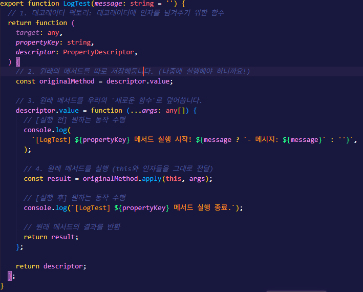 * LogTest()가 실행되면, 이 내부 함수가 리턴되어 NestJS(또는 TS)에게 전달됩니다.