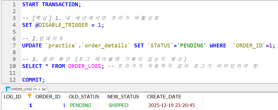 이 방식은 내 세션에서만 트리거를 끄기 때문에, 다른 사용자가 발생시키는 일반적인 트랜잭션에는 전혀 영향을 주지 않는 가장 안전한 방법입니다.