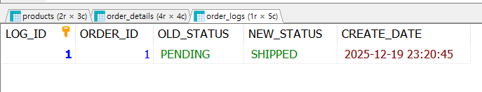 위처럼 변경을 하면 아래의 ORDER_LOGS에 자동으로 어떤값에서 어떤값으로 변경되었는지 트리거가 동작하여 데이터가 쌓이게 됩니다.