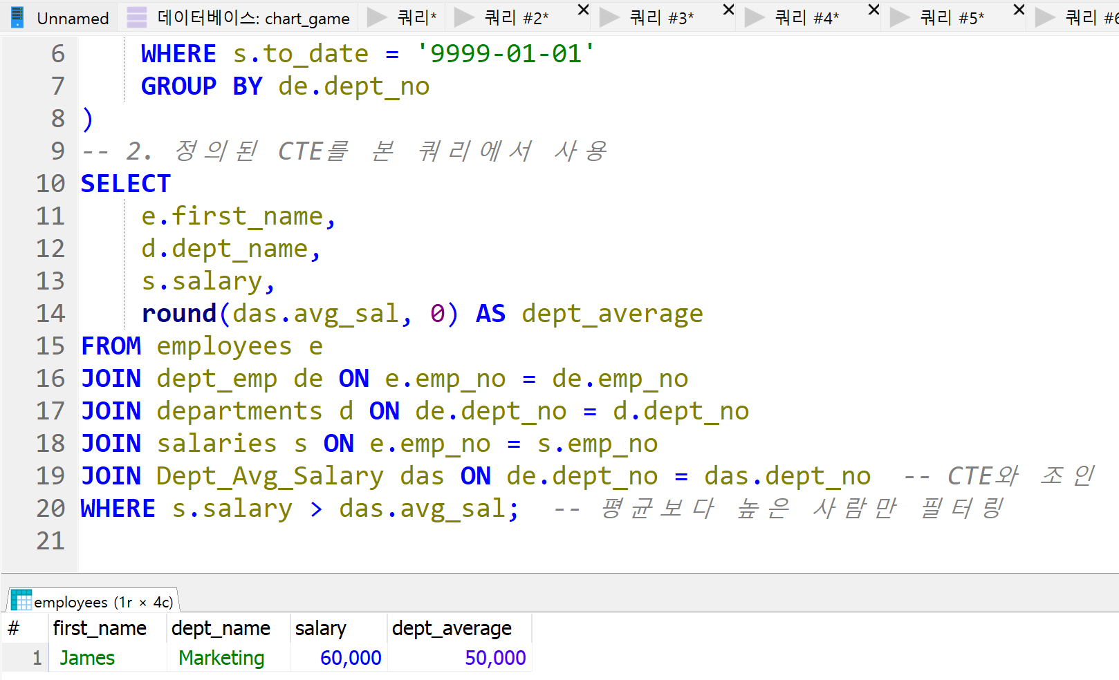 1편에서 만든 employees, departments, dept_emp, salaries 테이블을 활용하여 "부서별 평균 급여보다 많이 받는 직원 리스트"를 뽑아보겠습니다. 서브쿼리로 짜면 매우 복잡해질 내용입니다.